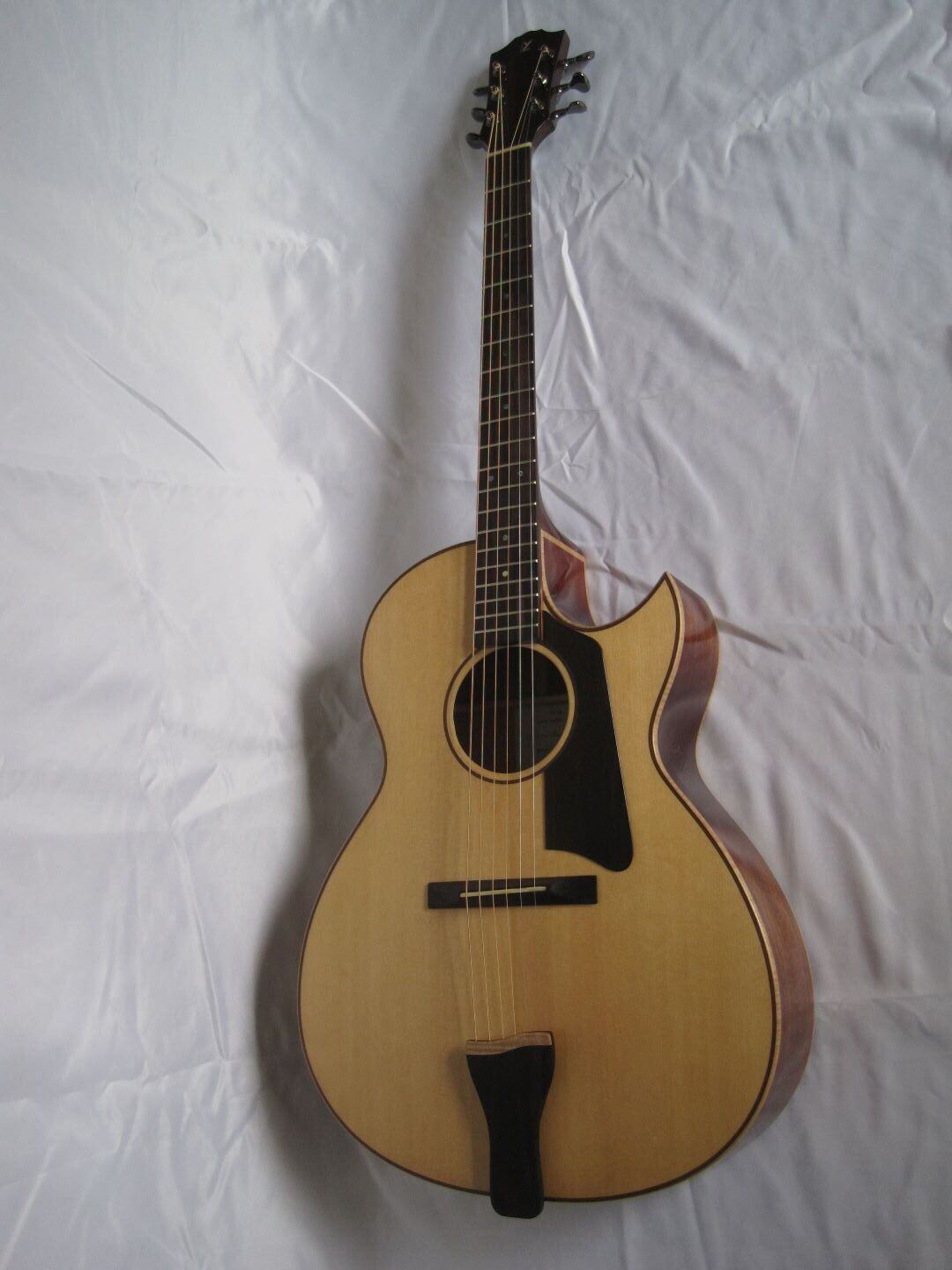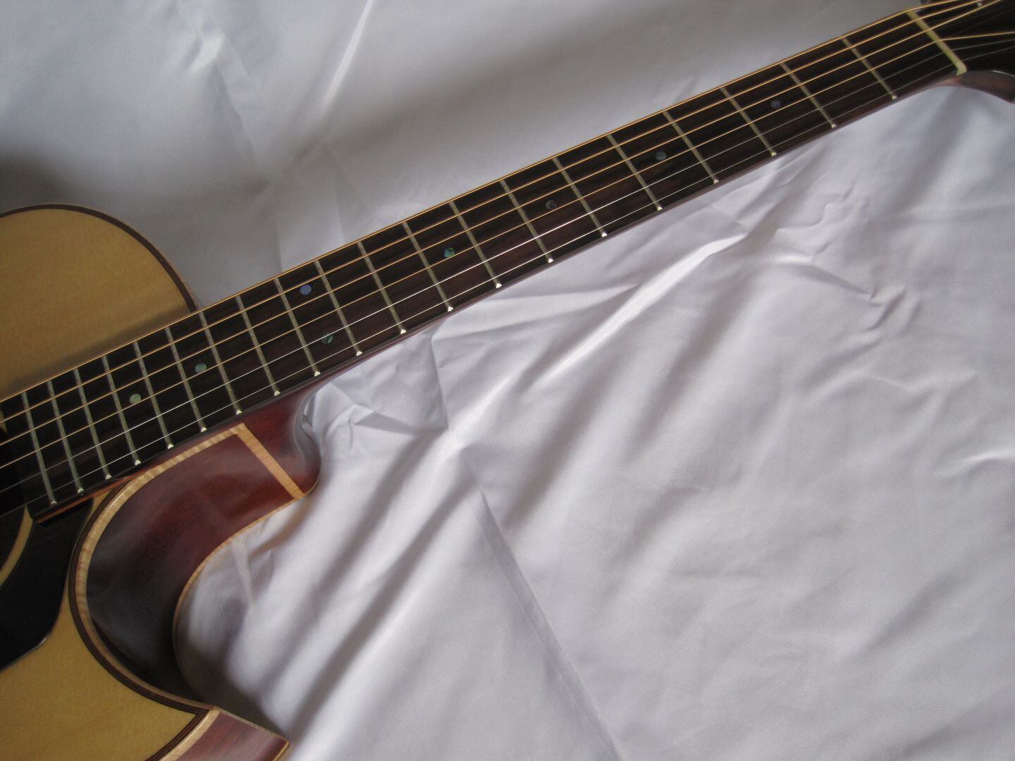 新しくオリジナルのボディ形状を採用しています。ドレッドノートのケースに収まるサイズで抱えやすく丸みを帯びた形です。音量豊かで弾き易く疲れない形を考えて製作しました。